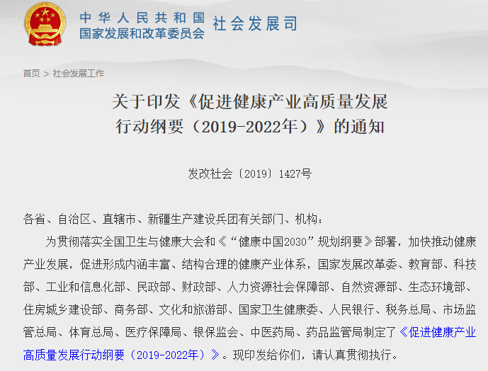 2019年8月,國家發(fā)改委官網(wǎng)發(fā)布了《促進健康產(chǎn)業(yè)高質(zhì)量發(fā)展行動綱要(2019-2022年)》。文件中明確:到2022年,基本形成內(nèi)涵豐富、結(jié)構(gòu)合理的健康產(chǎn)業(yè)體系,優(yōu)質(zhì)醫(yī)療健康資源覆蓋范圍進一步擴大,健康產(chǎn)業(yè)融合度和協(xié)同性進一步增強,健康產(chǎn)業(yè)科技競爭力進一步提升,人才數(shù)量和質(zhì)量達(dá)到更高水平,形成若干有較強影響力的健康產(chǎn)業(yè)集群,為健康產(chǎn)業(yè)成為重要的國民經(jīng)濟支柱性產(chǎn)業(yè)奠定堅實基礎(chǔ)。