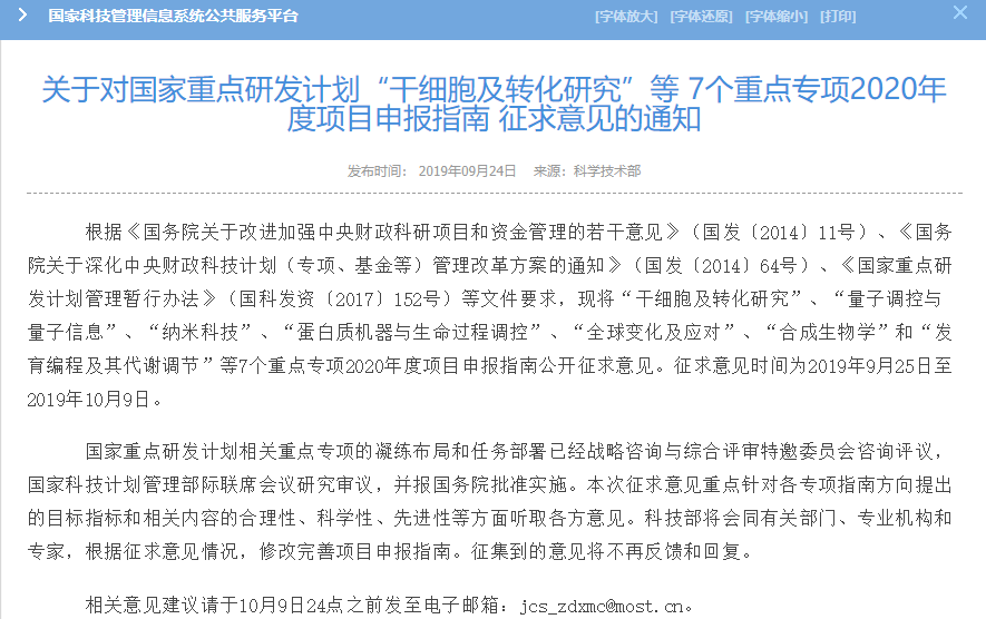 2019年9月,科技部官網(wǎng)發(fā)布了《“干細(xì)胞及轉(zhuǎn)化研究”試點專項2020年度項目申報指南(征求意見稿)》,意見稿中明確:國撥總經(jīng)費2.3億元(其中,擬支持青年科學(xué)家項目6個,國撥總經(jīng)費不超過 3600萬元)。